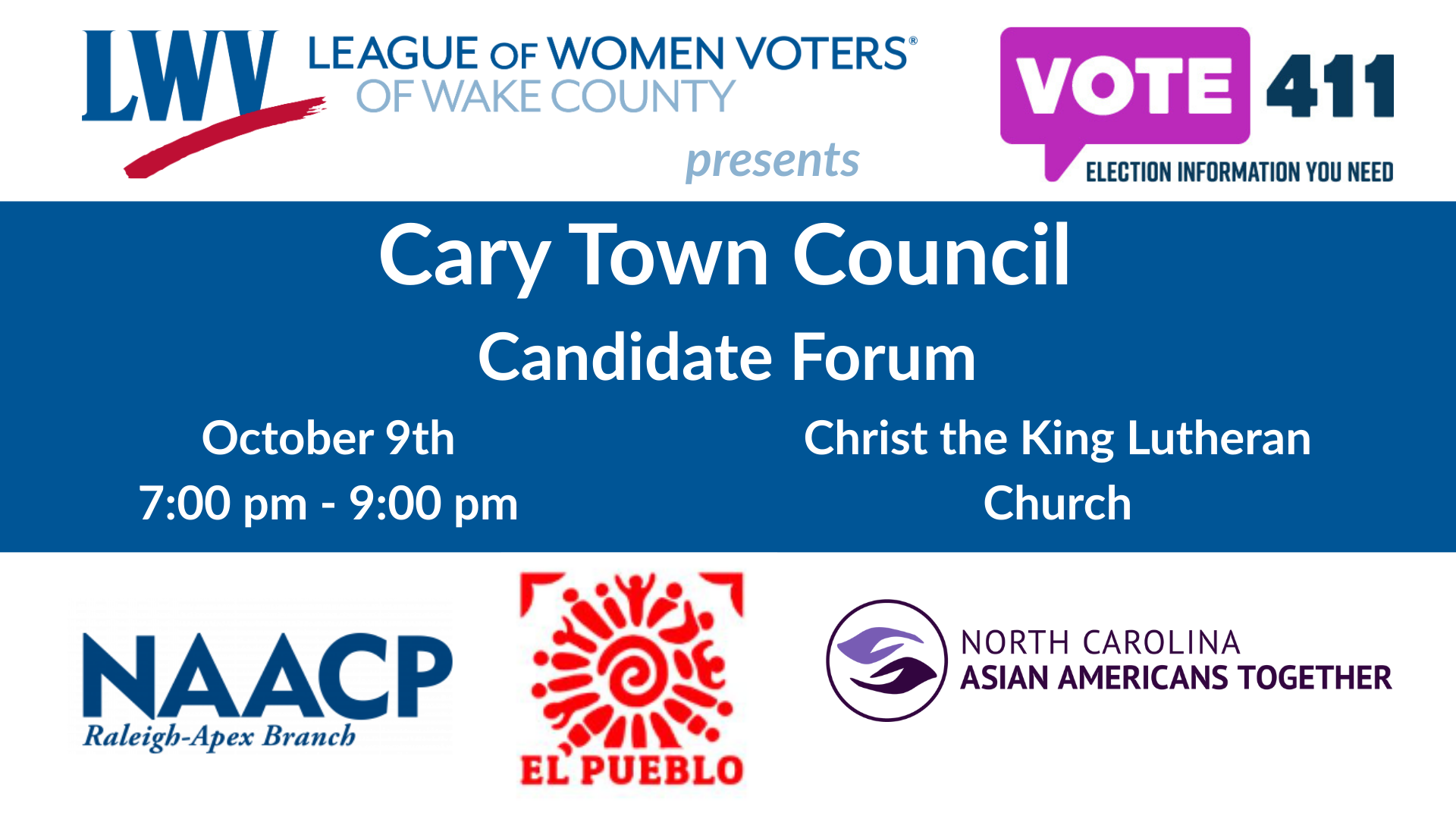 | In addition to the Cary Town Council Candidate Forum the LWVWake is presenting four more Candidate Forums that will be recorded and shared with you after October 10.