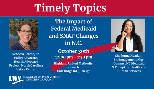This presentation will provide an overview of the Federal changes to Medicaid and SNAP, the impact of these changes in North Carolina, key decisions that the North Carolina General Assembly is facing, timelines for decisions, and actions League members can take in response to decisions that must be made.