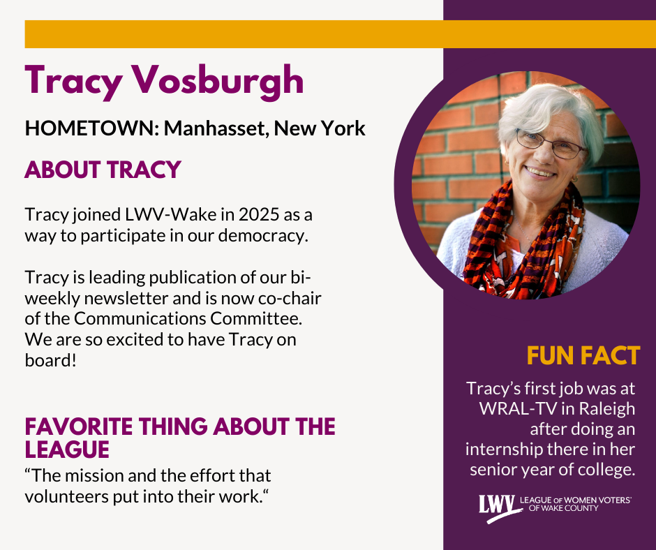Tracy Vosburgh lives in Raleigh and joined the Wake County League in April — and she didn’t waste any time getting involved! In just a few months, she’s become a key member of the Communications Committee, taken on responsibility for publishing the LWV-Wake bi-weekly newsletter, and recently agreed to co-chair the Communications committee with Cheryl Tung.