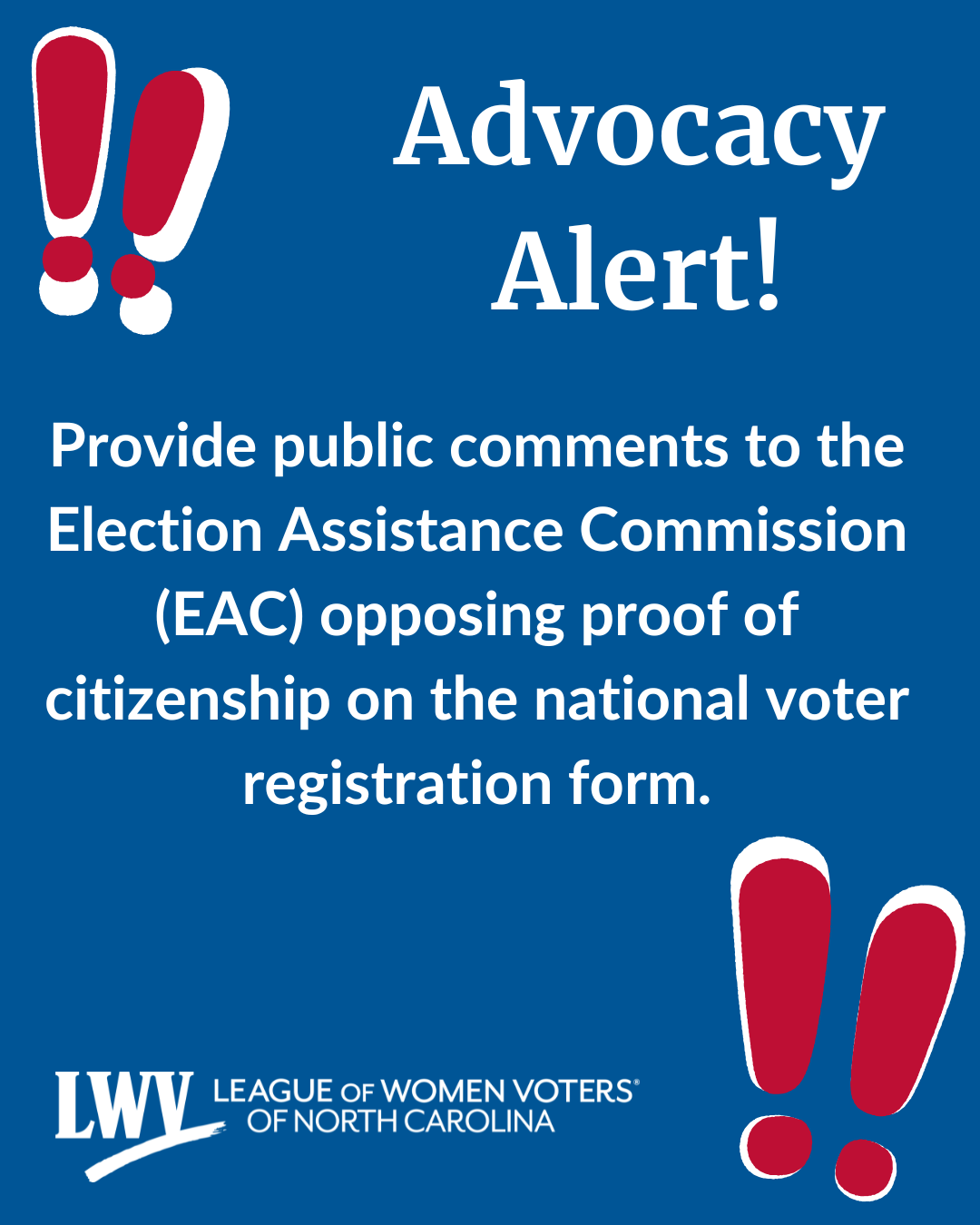 The LWVNC sent a message to urge every member to take action now by submitting a public comment to the EAC by October 20. A strong volume of public feedback will demonstrate that voters across the country are paying attention and will not accept regulatory changes that undermine access to the ballot. This proposal is still under review—and public input can make a real difference in stopping restrictive rules before they reach polling places in any state. Read more here. |  |