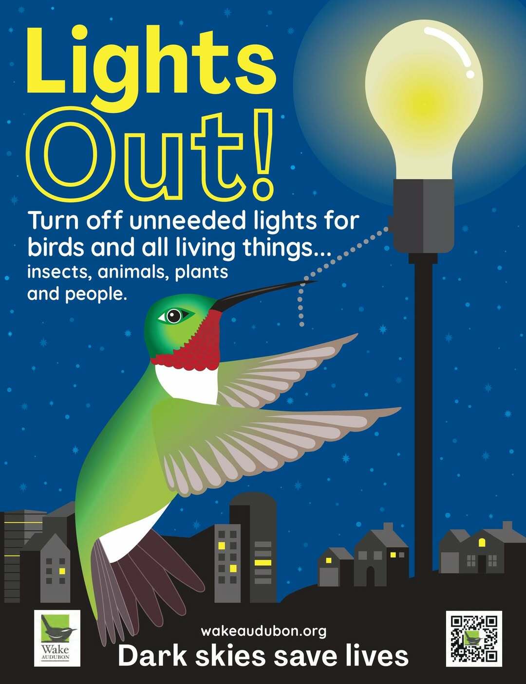 Lights Out NC occurs each fall from September 10 to November 30 and each spring from March 15 to May 31. Turn off unnecessary lights from 11:00 pm to 6:00 am.