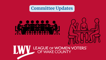 See more Events and Upcoming Meetings and register online. To learn more about LWV-Wake’s current committees or to email a chair/co-chair, go to our Our Work page. |  | | The Affordable Housing Committee will not be meeting in November and December. We will resume in January with exciting programming and advocacy opportunities. Join us for our book discussion by registering for the January meeting and to be added to the Book Discussion Group list.