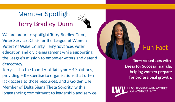 As the Chair for Voter Services, Terry will bring her widely recognized leadership and advocacy, to LWVWake. Terry continues to emphasize that engagement looks different for everyone—whether learning the issues, participating in discussions, or encouraging others to take part. What matters most is informed action.