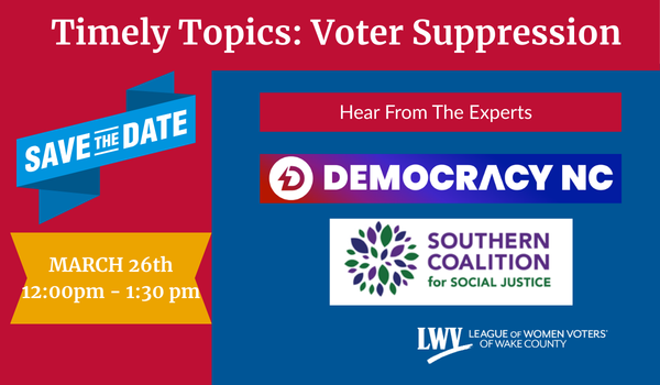 LWV-Wake Update 2/16/2026 | Welcome back to your exclusive, bi-weekly newsletter of the League of Women Voters of Wake County. If someone forwarded this to you and you'd like to become a member, or are interested in learning more, just click here. |  |