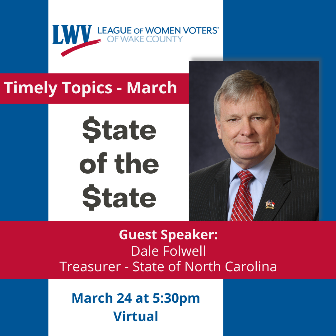 Join North Carolina State Treasurer Dale R. Folwell for a State of the State overview. Treasurer Folwell will discuss the challenges of managing the $122 billion state pension fund, which provides retirement benefits for teachers, law enforcement, and public workers; and the State Health Plan, which provides medical and pharmaceutical benefits to over 750,000 current and retired workers.